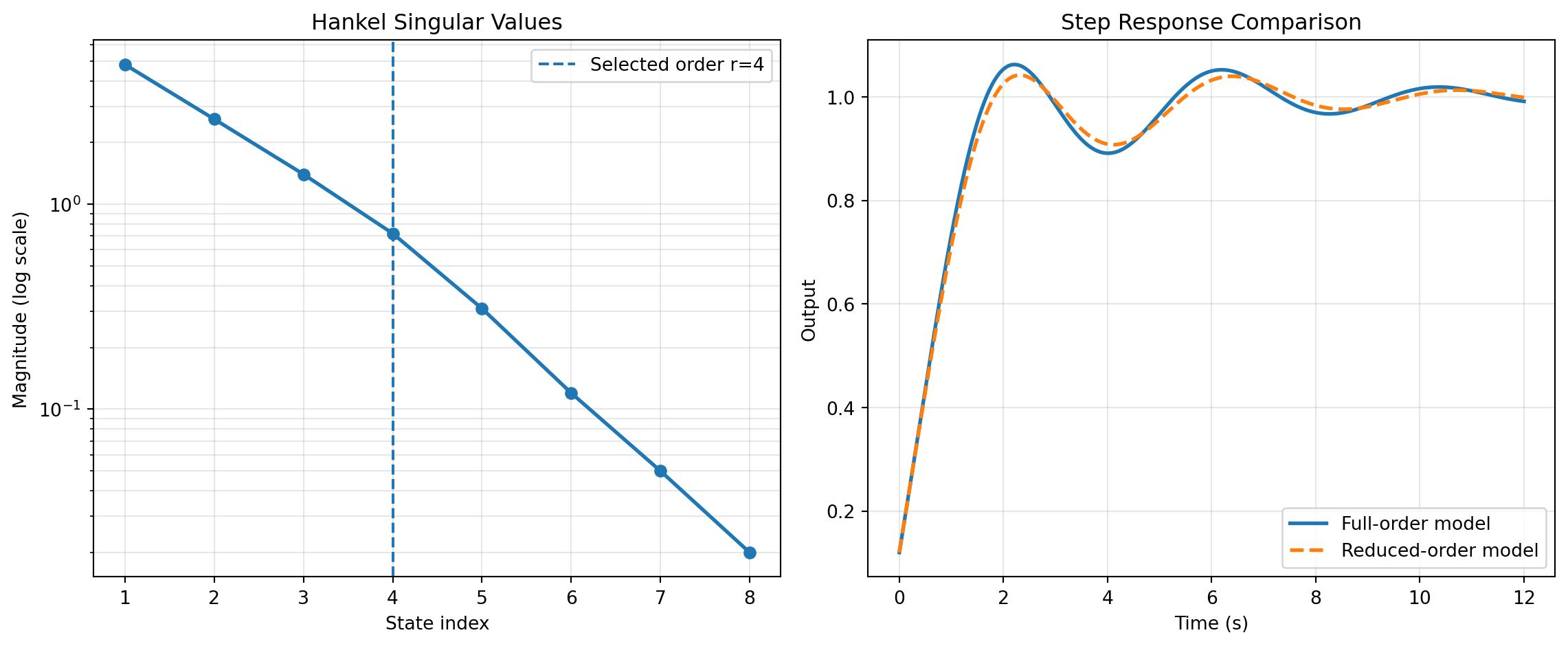 Figure 1: Model reduction diagnostics: (left) Hankel singular value decay suggests a truncation point; (right) full vs. reduced step responses show dominant behavior retention.