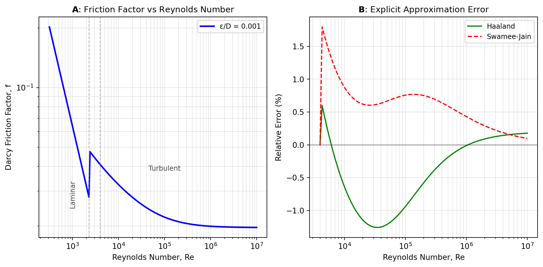 Figure 1: Friction factor behavior: (A) Transition from laminar to turbulent flow for relative roughness ε/D = 0.001 showing critical Reynolds numbers. (B) Relative error of explicit approximations (Haaland, Swamee-Jain) compared to the implicit Colebrook equation.