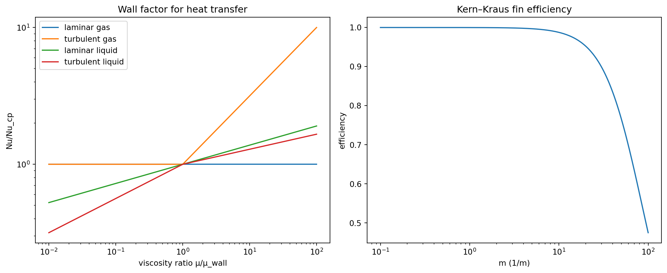 Figure 1: Wall factor correction curves (left) illustrate the power-law dependence on viscosity ratio. Fin efficiency trends (right) show the influence of the conduction-convection parameter m.
