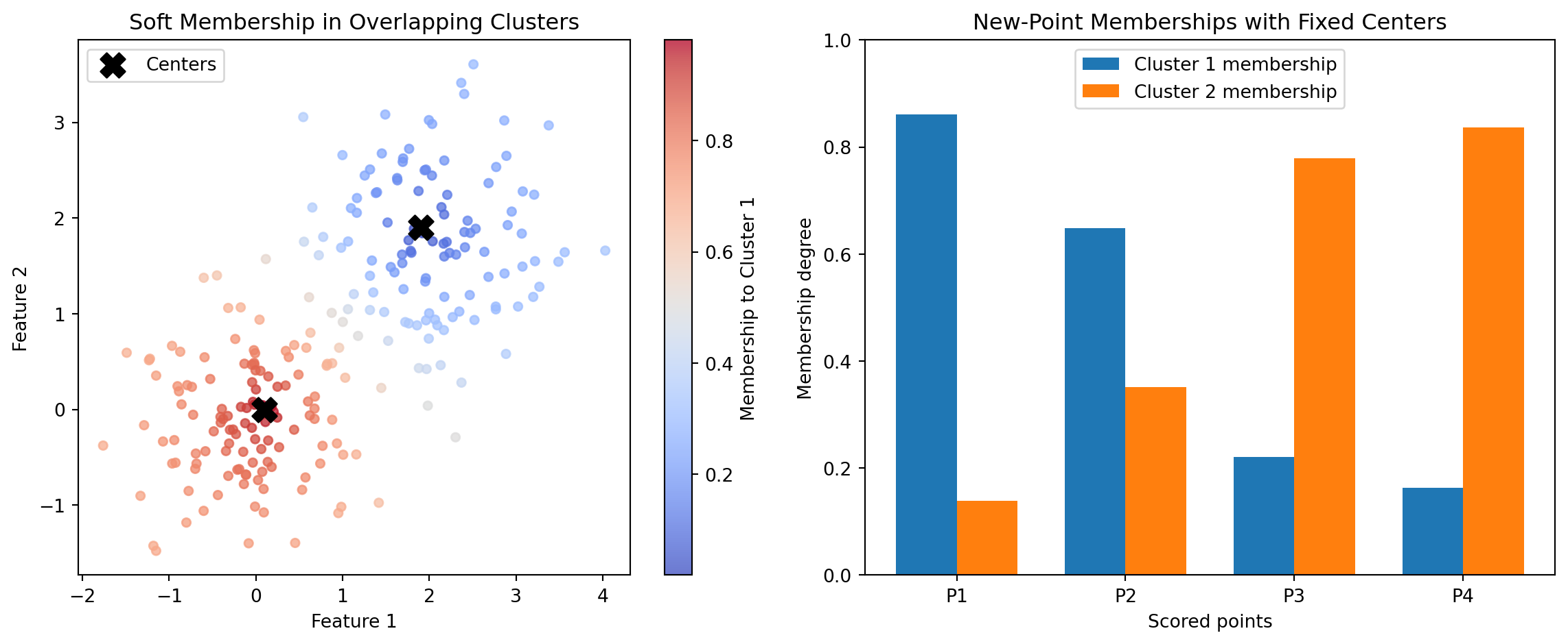 Figure 1: Fuzzy clustering overview: (left) two overlapping clusters with soft memberships, (right) membership profiles for new points scored against fixed centers.