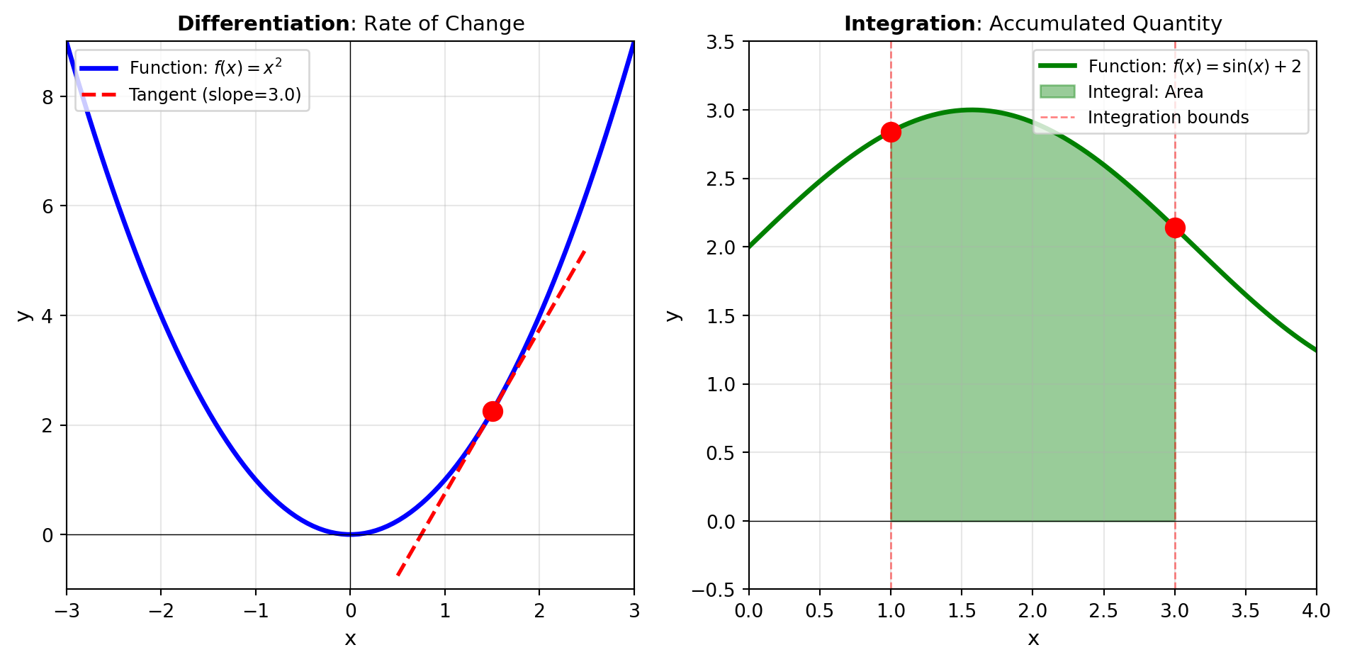 Figure 1: Core Calculus Operations: (A) Differentiation measures instantaneous rates of change, essential for optimization and sensitivity analysis. (B) Integration accumulates quantities over regions, fundamental for computing areas, volumes, and total effects.