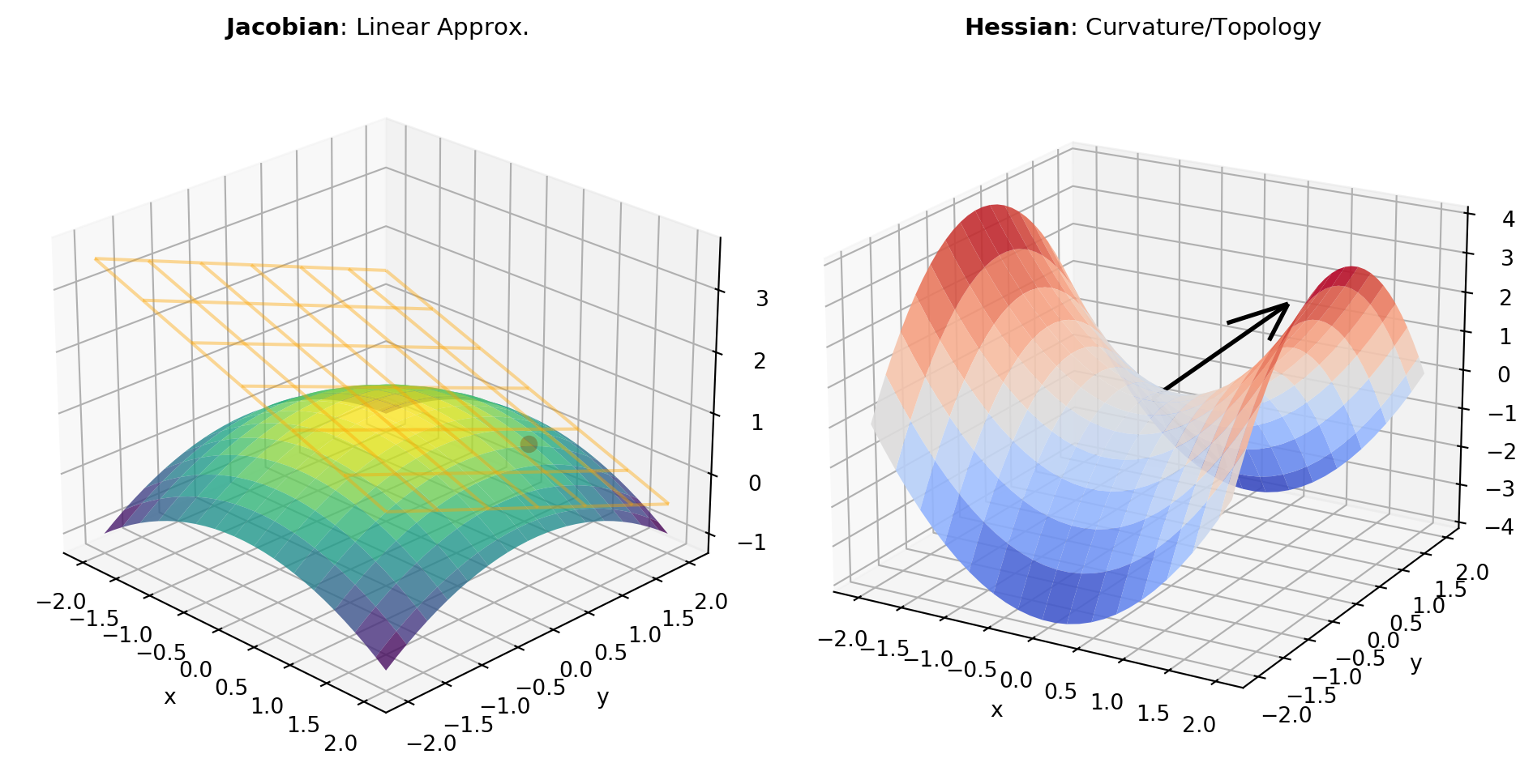 Second-Order Derivatives: The HESSIAN captures second-order curvature information. Hessian matrices reveal the topological structure of functions: positive definite regions indicate convex regions (minima), negative definite regions are concave (maxima), and indefinite regions contain saddle points. Second derivatives are essential for Newton’s method, trust-region optimization, and convergence analysis.