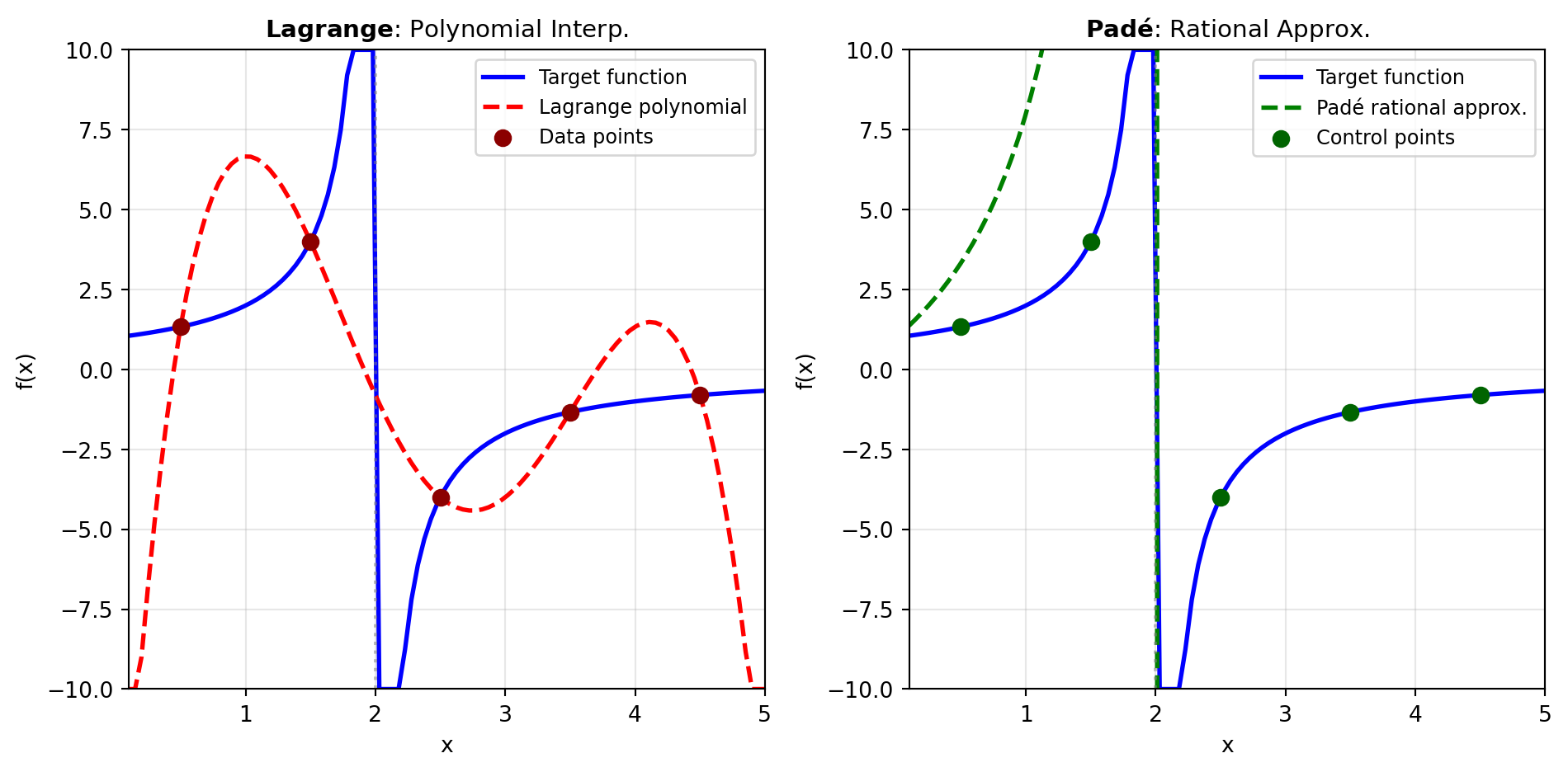 Choosing Between Approximation Methods: Use polynomial approximation when you need simplicity, have few interpolation points, or require exact values at specific locations. Choose rational approximation when dealing with functions exhibiting poles, when you need better accuracy with fewer terms, or when approximating functions with singularities. Figure 1 illustrates how these methods complement each other in capturing function behavior with different characteristics.