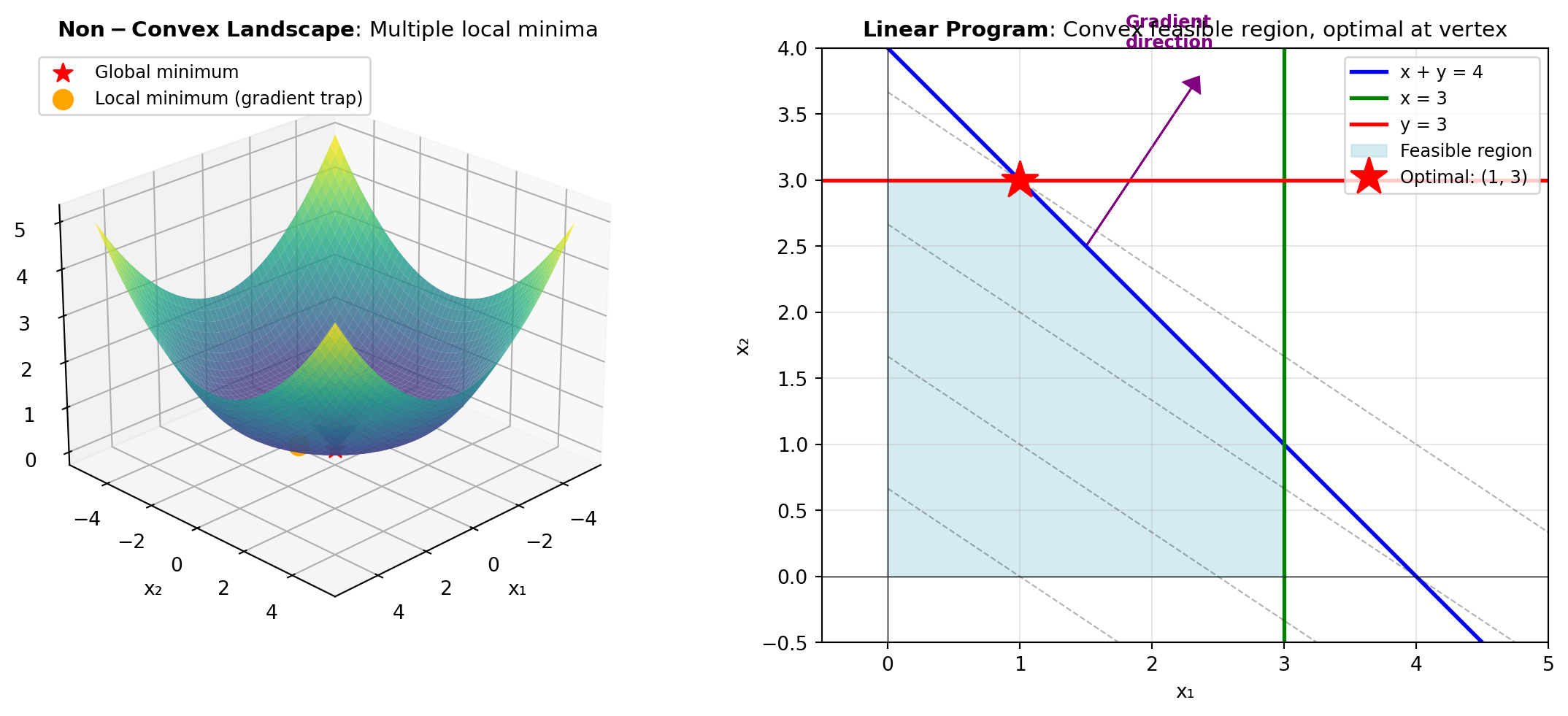 A mathematical optimization problem is typically expressed as: minimize or maximize f(x) subject to constraints g(x) \leq 0, h(x) = 0, and x \in \mathbb{R}^n. The objective function f maps decision variables to a scalar value we seek to optimize, while constraints define the feasible region—the set of acceptable solutions. Problems vary dramatically in structure: some have linear objectives and constraints, others are highly nonlinear, and still others involve discrete (integer) variables. The structure of your problem determines which algorithm is most suitable.