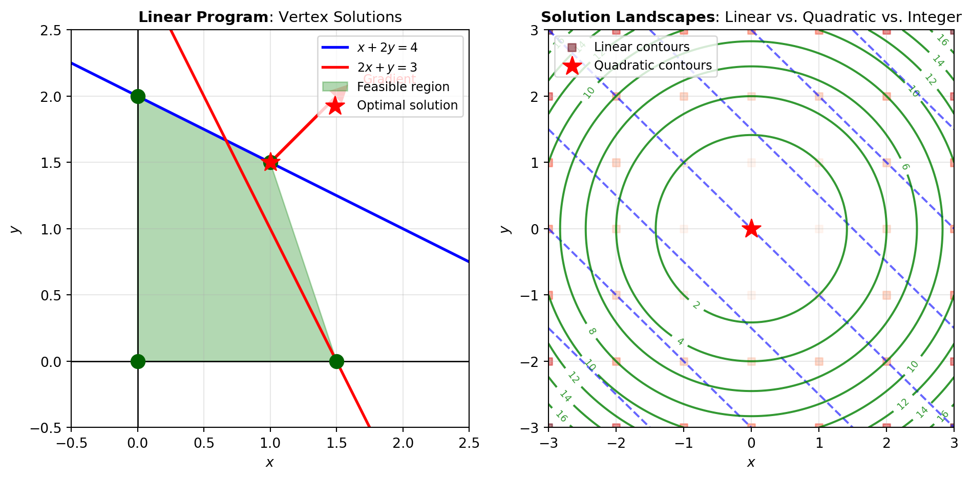 Figure 1 illustrates the geometric intuition behind linear programming and shows how the solution landscape differs between linear, quadratic, and integer programs.