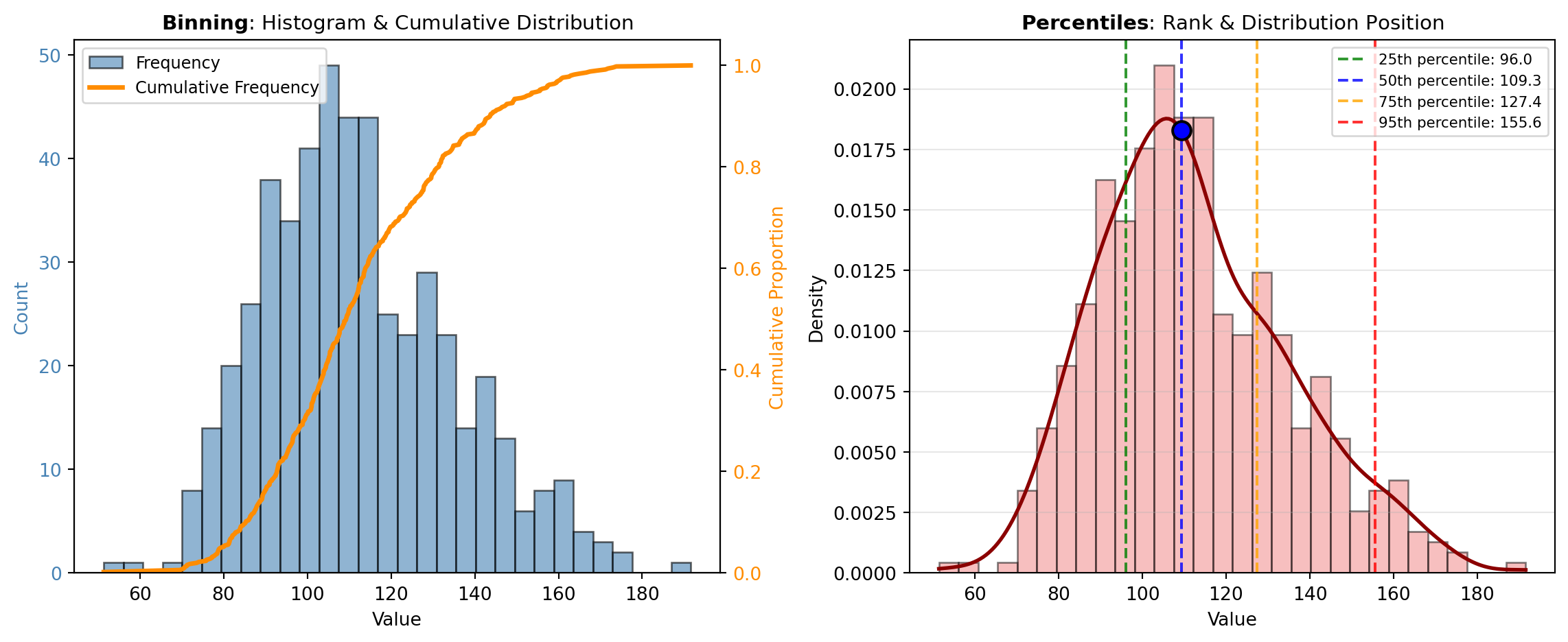Figure 1: Frequency Statistics Concepts: (A) Histogram with binned relative frequencies and cumulative distribution overlay, showing how data is partitioned and how cumulative counts accumulate. (B) Percentile interpretation showing a distribution with marked percentile ranks and the inverse mapping from percentiles to values.