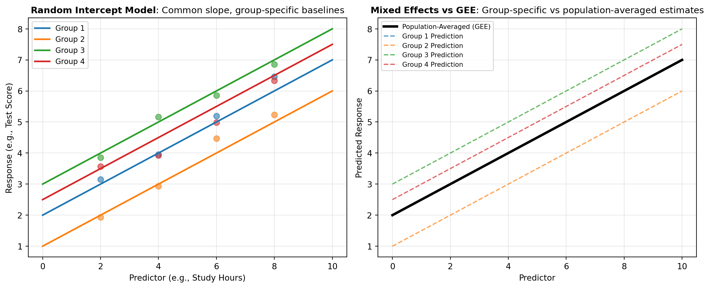 Figure 1: Comparison of mixed effects modeling approaches: (A) Random intercept model showing how the baseline differs across groups while maintaining a common slope. (B) Comparison of predictions from population-averaged (GEE) versus group-specific (mixed model) approaches.
