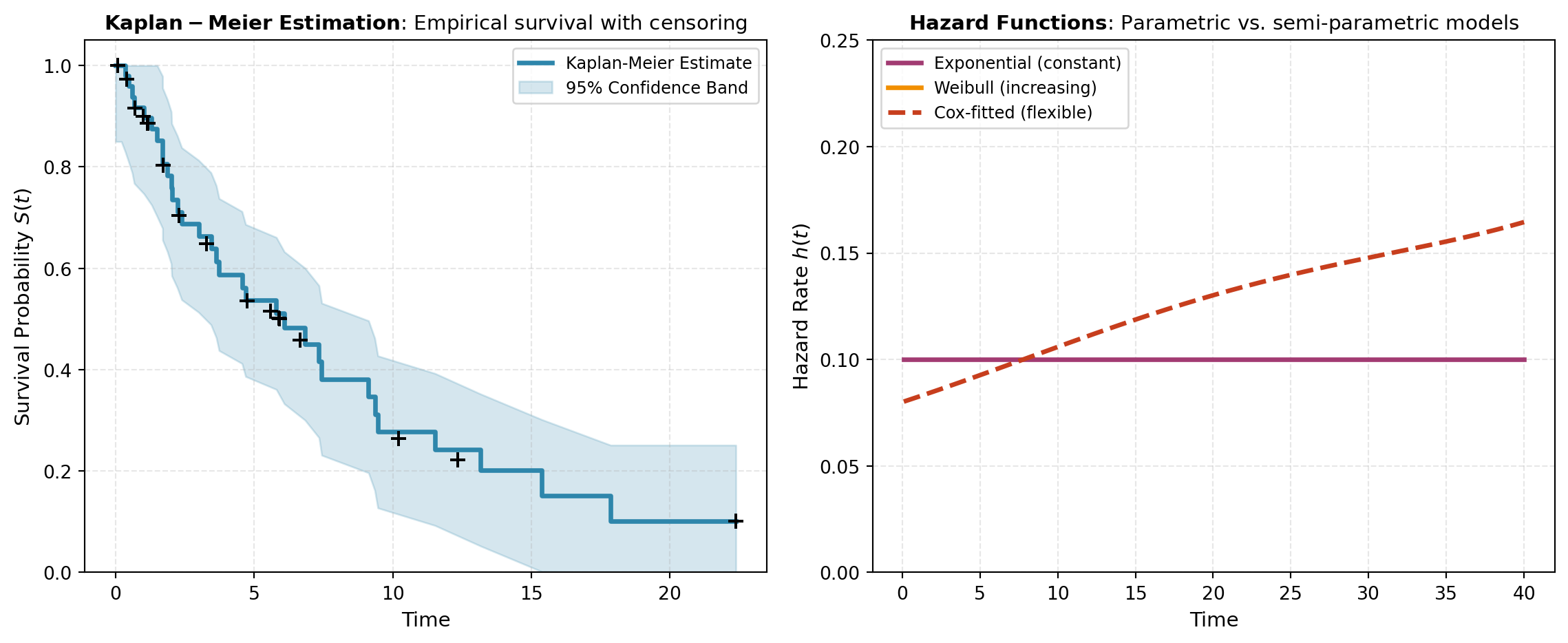 Figure 1: Survival analysis concepts: (A) Kaplan-Meier survival curve with censoring indicators showing empirical survival estimates and confidence bands. (B) Comparison of parametric (exponential) and semi-parametric (Cox) fitted hazard functions, demonstrating how model assumptions affect inferred failure risk over time.