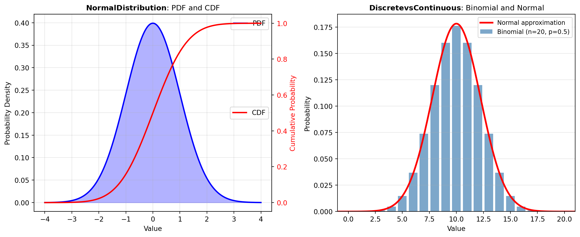 Every probability distribution is defined by its probability density function (PDF) for continuous variables or probability mass function (PMF) for discrete variables, which specifies the relative likelihood of each outcome. Associated with each distribution are its cumulative distribution function (CDF) for calculating probabilities up to a threshold, quantile functions for finding threshold values, and key summary statistics like mean, variance, and skewness that characterize its behavior.