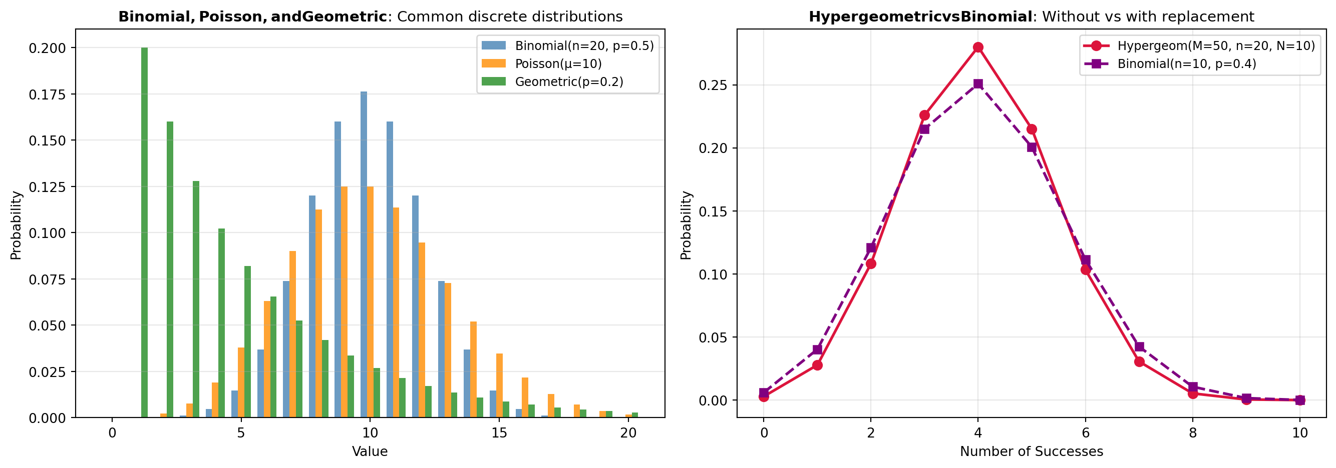 Figure 1: Common discrete probability distributions: (A) Binomial, Poisson, and Geometric distributions showing different shapes based on parameters. (B) Comparison of Hypergeometric and Binomial distributions illustrating sampling with and without replacement.