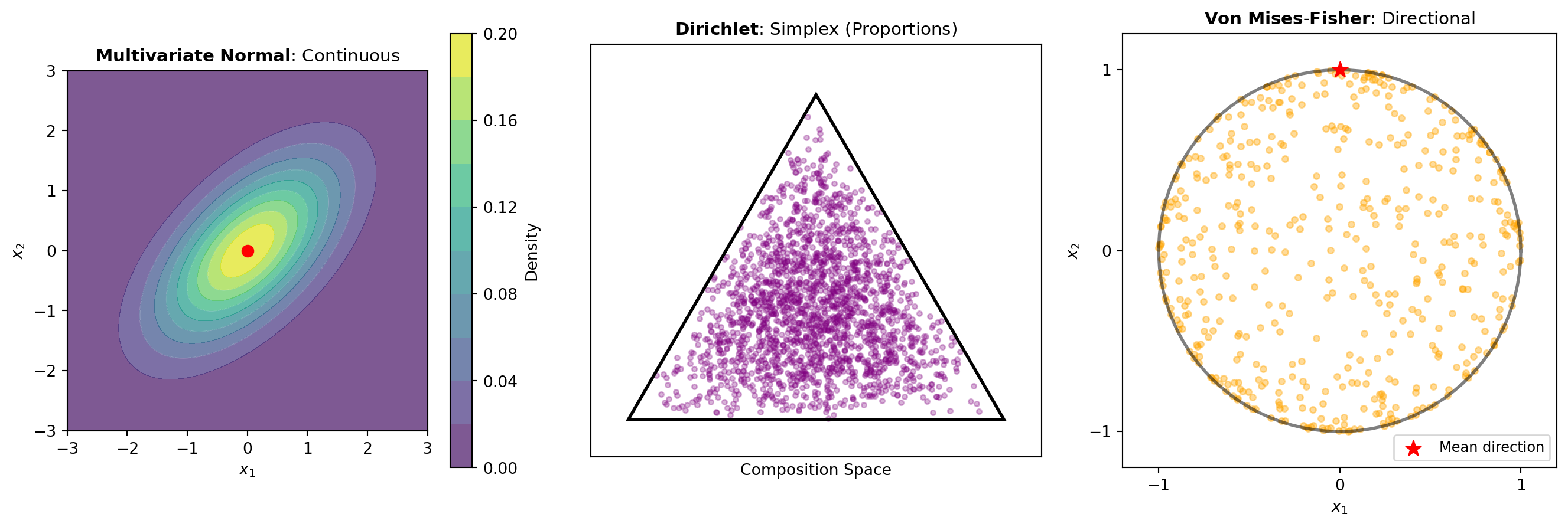 Figure 1 illustrates key distinctions across these distribution families: the normal model capturing continuous multivariate relationships, the simplex-constrained Dirichlet handling compositional data, and the von Mises-Fisher directing observations on the sphere.