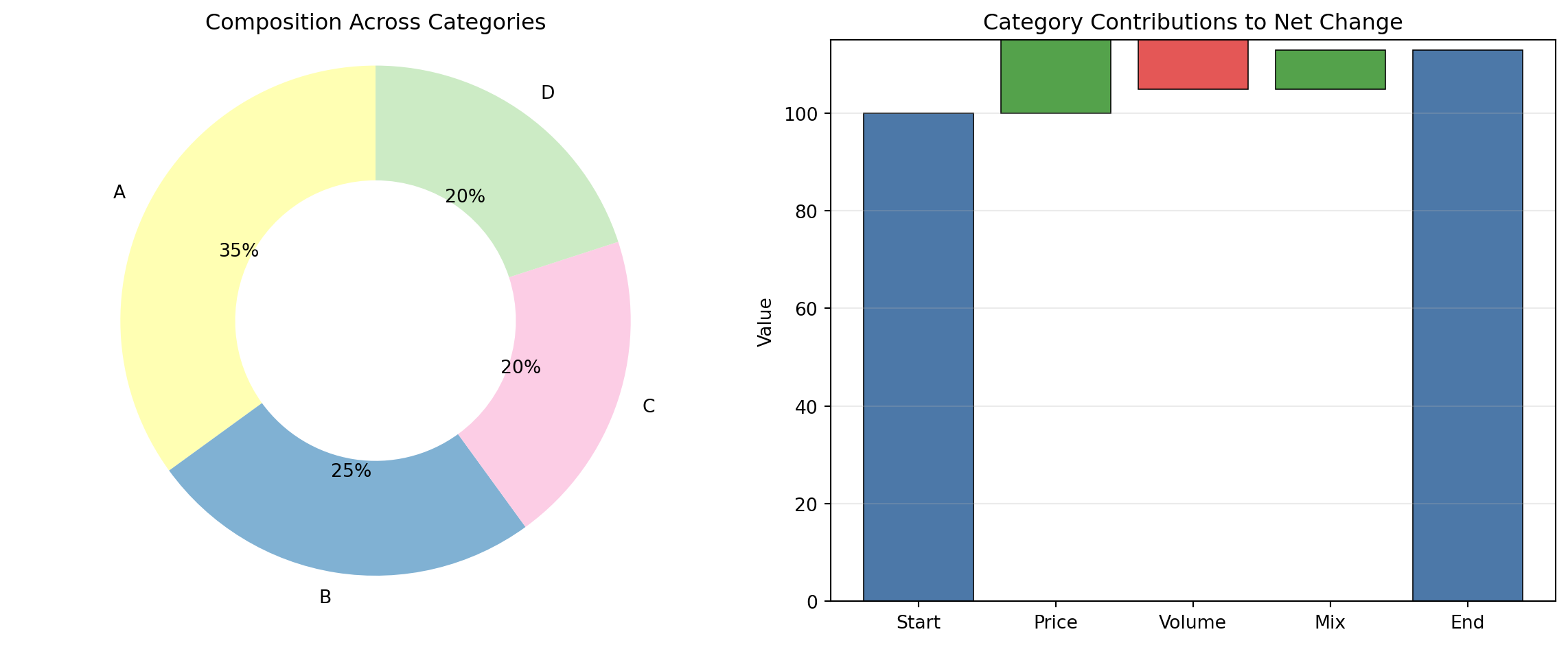 Figure 1: Categorical chart concepts: a composition view (donut) and a contribution view (waterfall) for the same business context.