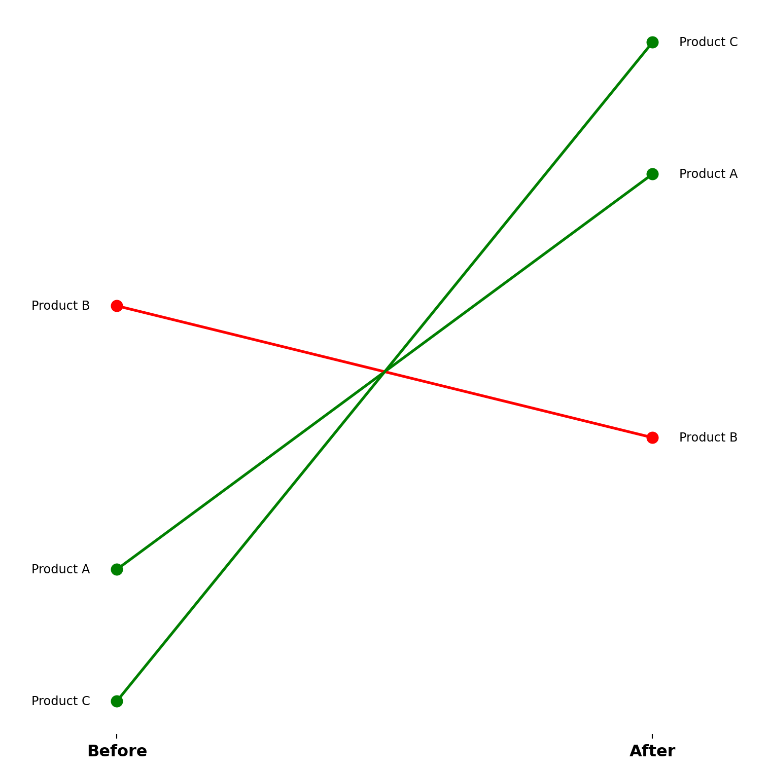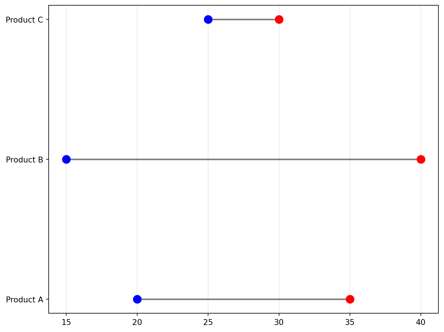 For before/after and contribution analysis, DUMBBELL, SLOPE, and WATERFALL make change explicit. Dumbbell and slope charts connect paired values per category to show direction and magnitude of movement between two states (for example baseline vs current period). Waterfall charts decompose a running total into positive and negative contributions, clarifying how individual components build to a final result. These are especially useful in financial bridge analysis, KPI decomposition, and scenario reviews.