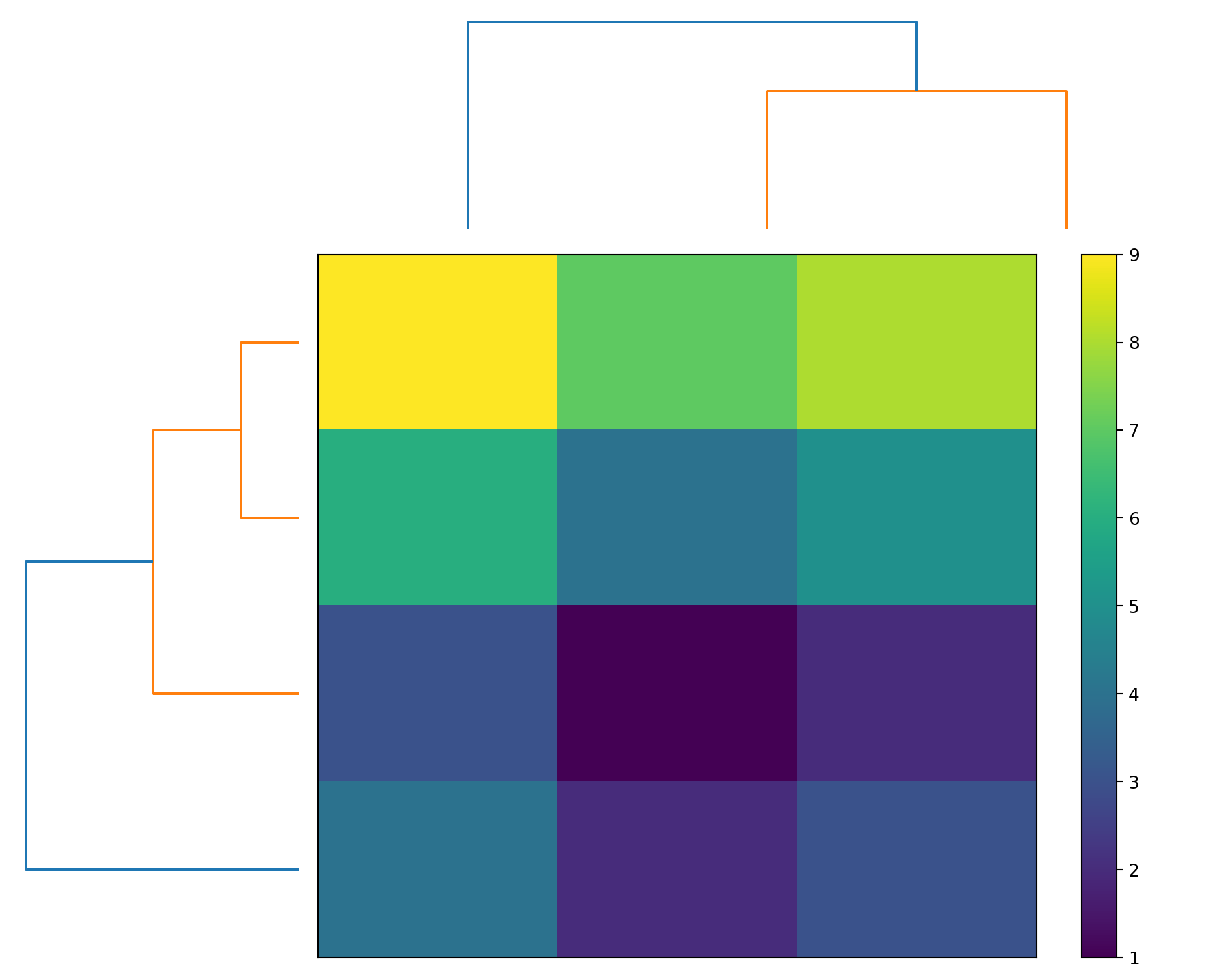 =CLUSTER_MAP({1,5,3;4,2,6;7,9,8;2,4,1}, "plasma")