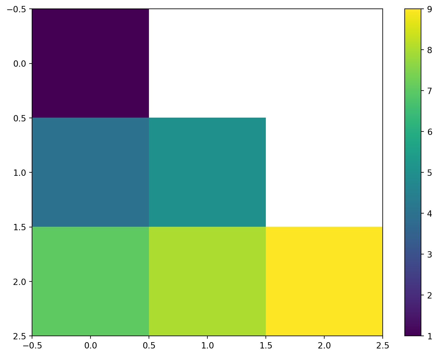 =TRIANGULAR_HEATMAP({1,2,3;4,5,6;7,8,9}, "upper")