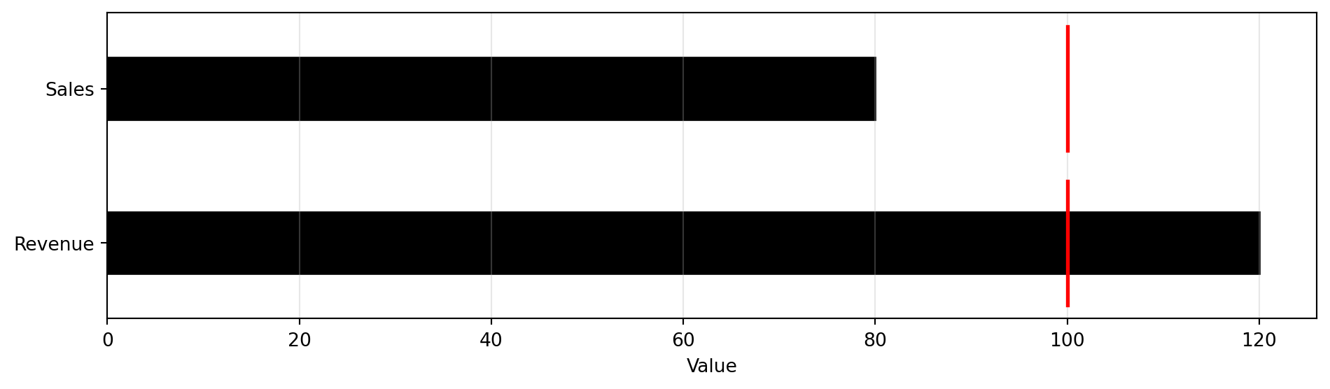 =BULLET({"Sales",80;"Revenue",120}, 100)