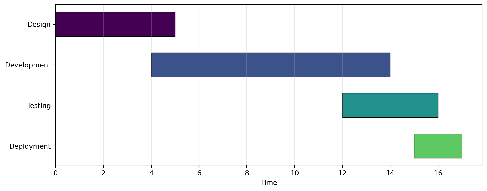 Scheduling and Flow Structure: GANTT and SANKEY represent relationships where position and direction matter. GANTT maps start times and durations into horizontal task bars, which is useful for project planning, dependency review, and resource coordination. SANKEY encodes magnitude-preserving flows between inputs and outputs, helping analysts inspect allocation, transfer, or loss patterns in systems such as budgets, energy balances, or process streams. Both charts are especially practical when stakeholders need to understand structure rather than only aggregate totals.