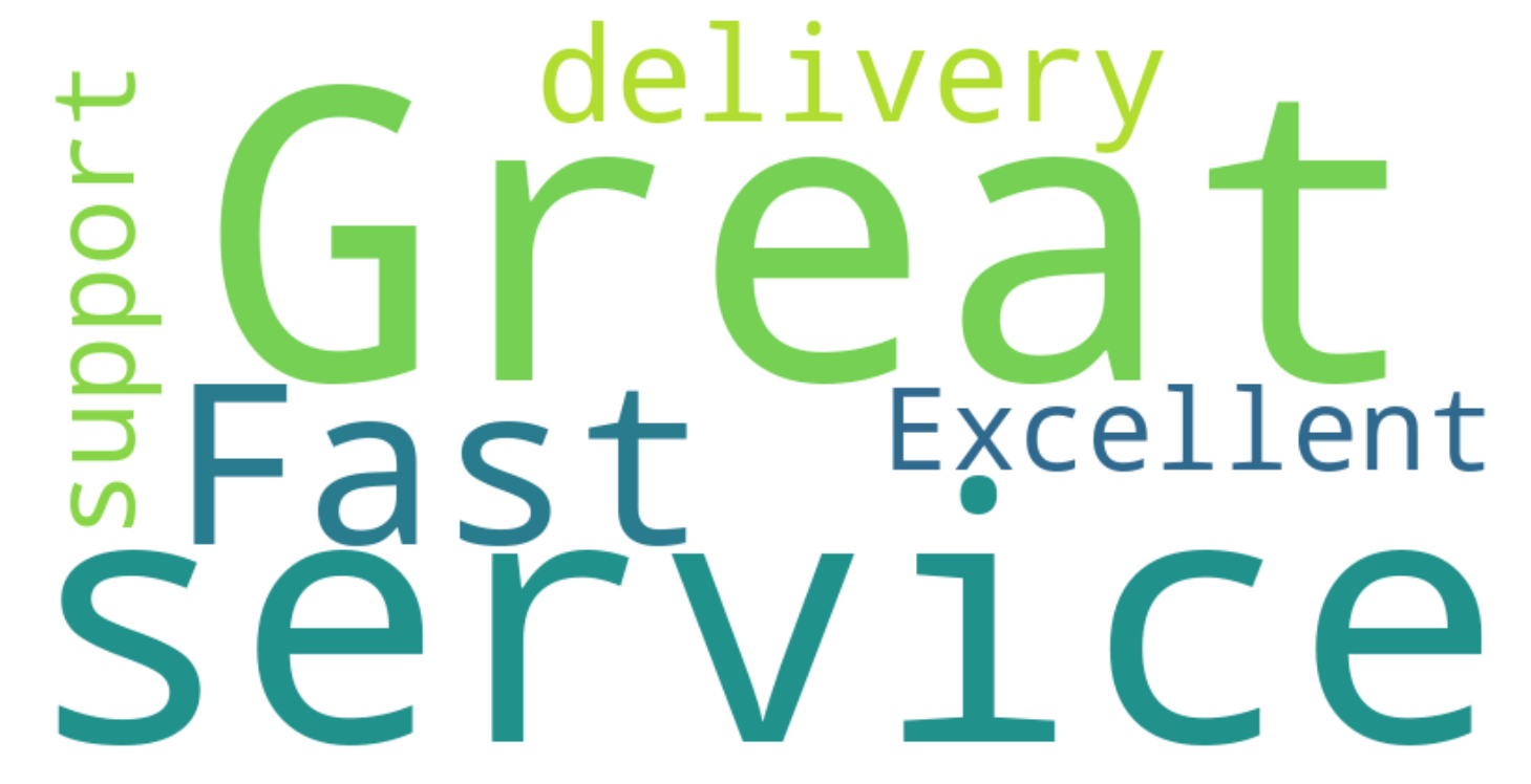 =WORDCLOUD({"Great service";"Fast delivery";"Excellent support"}, 10, "white", "viridis")